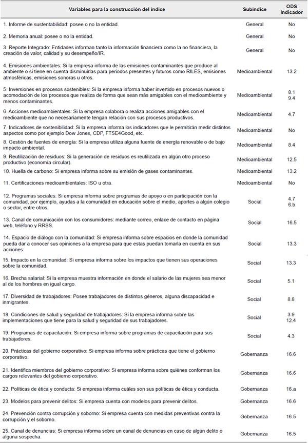 Se realizó la evaluación con base en una lista de chequeo elaborada para esta investigación compuesta por 25 variables, disponibles en Anexo A, relacionados con los ODS. En relación con estos, se analiza la disponibilidad de información de contenido en los sitios web de las entidades organizadas en tres subíndices y un índice total, siguiendo trabajos previos de Morales, Vergara y Jara (2022) los cuales se pueden ver en la Tabla 2.