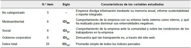 La construcción del índice total (IDITOT) mide el tipo y nivel de divulgación en las empresas y es la parte central de la investigación pues permite desarrollar un estudio individualizado por país y sector, y evaluar el grado de comparabilidad nacional según las informaciones no financieras disponibles en los sitios web o en reportes en el mismo sitio. Esto permitirá identificar las similitudes y diferencias existentes entre las divulgaciones de las empresas evaluadas, con lo cual será posible clasificarlas según la puntuación del índice total, así como por dimensiones.