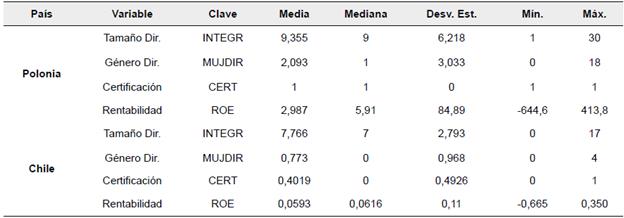 Se midieron los índices en la escala de 0 a 1, y se obtuvo un promedio total de la muestra de 0,41, lo cual reflejar un rendimiento de un 4I% de cumplimiento en promedio de todas las variables evaluadas. A nivel total, los índices entre las empresas polacas y chilenas resultaron similares, con una mediana un poco superior en el caso chileno. Sin embargo, en las variables de carácter general es destacable que el 100% de las empresas polacas de la muestra dispongan de informes de sustentabilidad y memoria anual versus el 40,2% de empresas chilenas, que reportaron un informe de sostenibilidad, y solo un 93% disponía de la memoria anual en el sitio web corporativo. Sobre el reporte integrado, un 4I% de empresas polacas los disponía, por oposición al correlativo 10% de las empresas chilenas, lo que da cuenta de que esta nueva tendencia de reporte se ha introducido más lentamente en el mercado chileno. Los resultados por índice y país se presentan en la Tabla 4.