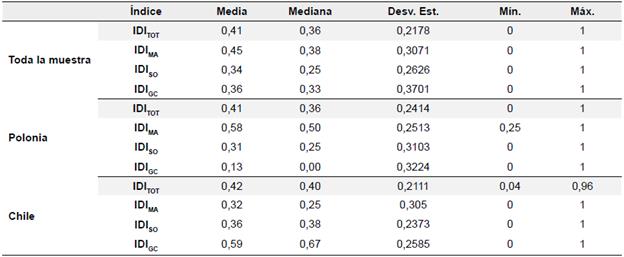El índice de revelación total (IDITOT) es estadísticamente similar para las empresas chilenas y polacas; no obstante, es un resultado que puede inducir a error de no observarse detenidamente por los ámbitos evaluados (los subíndices o índices parciales determinados) ya que se descubrieron diferencias significativas en ellos. El índice de revelación medio ambiental (IDIMA) es mayor en las empresas polacas mientras que los índices de revelación de gobierno corporativo (IDIGC) y el índice de revelación social (IDISO) es significativamente mayor en empresas chilenas.