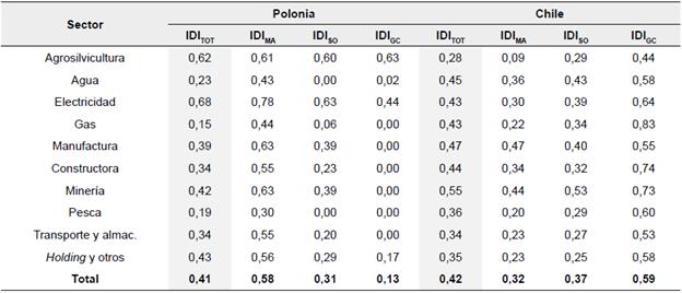 Los datos permiten observar los resultados según los sectores a los que representan las empresas de la muestra. En la Tabla 5 se puede ver como en Polonia son las empresas de agrosilvicultura (0,62) y electricidad (0,68) las que lideran la revelación medida a nivel total, mientras que en Chile es la minería la que arroja su mejor desempeño en la medición a nivel total (0,55). A nivel de subíndices, se ve una marcada diferencia, ya que las europeas arrojan buenos resultados en medioambiente en casi todos los sectores (solo destaca negativamente la pesca con sólo un 0,30), mientras que las chilenas con menores promedios son muy regulares (a excepción de agrosilvicultura, con 0,28). A nivel del subíndice social destacan en las empresas polacas los mismos elementos que a nivel total, del seguramente promueven el alza la agrosilvicultura y la electricidad, al tiempo que en Chile es la minería el sector que presenta mejores resultados en este índice (0,53). Finalmente, en los aspectos de gobernanza corporativa, las firmas chilenas mantienen un buen desempeño por sobre las polacas en casi todos los sectores; en el país latino destacan los sectores de gas (0,83), construcción (0,74) y minería (0,73), mientras que en Polonia sólo la agrosilvicultura arrojó un resultado destacable. El resumen de los índices por sector se presenta en la Tabla 5.