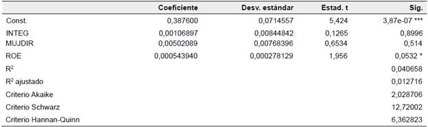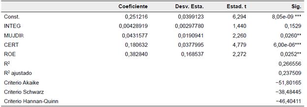 Se observa que han resultado significativas las variables certificación medioambiental al 1% de significancia y género, representado por el número de mujeres en el directorio, al 5% de significancia, lo que demuestra la relevancia de ambas variables sobre la divulgación total medida en las empresas chilenas, si se tiene en cuenta que el modelo posee 23,8% de significatividad según su R2 ajustado. Las variables ROE y tamaño del directorio no resultaron significativas.