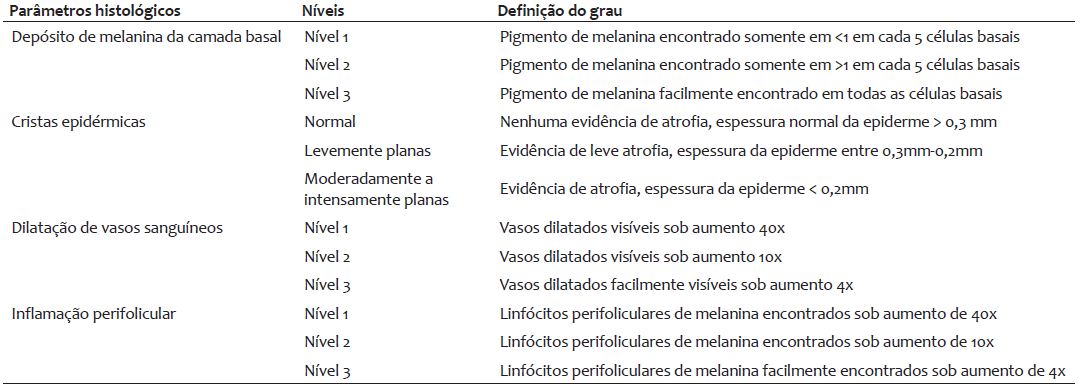 Os tecidos cutâneos embebidos em parafina foram processados com o corante Fontana-Masson objetivando evidenciar depósitos de melanina e o padrão de distribuição nos espécimes da pálpebra. O depósito de melanina na camada basal da epiderme foi classificada em: Nível 1 = baixo, Nível 2 = moderado e Nível 3 = alto. A profundidade da distribuição da melanina (isto é, até a derme papilar ou até a derme reticular) também foi analisada. A coloração de Pearl foi usada para observar a presença de hemossiderina. As cristas epidérmicas foram descritas como normais, levemente planas, de moderadamente a intensamente planas. O grau de vasodilatação dos vasos sanguíneos na derme foi classificado em: Nível 1, Nível 2 ou Nível 3. A inflamação perifolicular foi descrita como Nível 1, Nível 2 ou Nível 3 (Tabela 1).