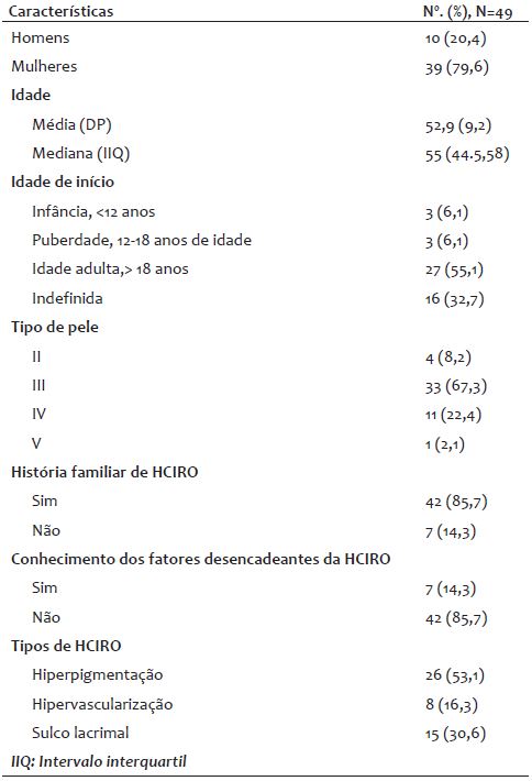 Quarenta e nove pacientes (homens = 20,4%, n = 10 / mulheres = 79,6%, n = 39) com idade média de 52,9 ± 9,2 anos preencheram os critérios de inclusão e concordaram em participar do estudo. Um total de 67,3% dos respondentes foram classificados como grau III segundo a escala de Fitzpatrick, enquanto 22,3% foram classificados como grau IV, 8% como grau I e 2% como grau V. Um total de 85,7% dos entrevistados não tinham conhecimento dos fatores desencadeantes de sua HCIRO, sendo que 55,1% afirmaram que notaram suas olheiras pela primeira vez na idade adulta, e até 85,7% dos entrevistados afirmaram que sua HCIRO não estava associada à história familiar (Tabela 2).