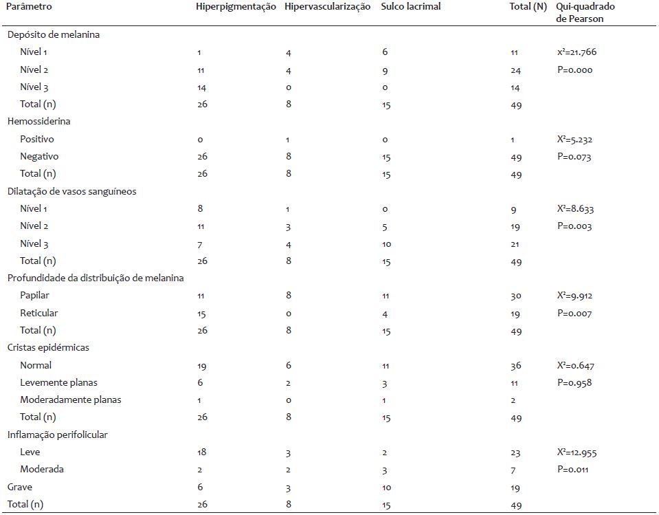 MÉTODOS: Quarenta e nove voluntários saudáveis foram classificados em 3 grupos: (i) hiperpigmentação, (ii) hipervascularização e (iii) sulco lacrimal. As deposições de melanina e hemossiderina, a dilatação dos vasos sanguíneos, a inflamação perifolicular e as estruturas das cristas epidérmicas foram analisadas histologicamente; a associação com o tipo de HCIRO foi analisada pelo teste do qui-quadrado de Pearson.