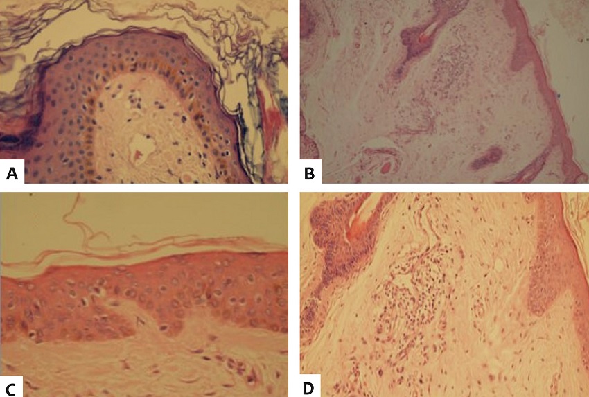 Os achados de Metcalf e cols. foram mais expressivos, tendo 92,3% dos pacientes evoluído com aumento da fibroplasia em derme papilar associada a redução da elastose solar, além da restauração da espessura normal da epiderme. Todos esses achados tiveram significância estatística.19 Kligman e cols. relatam em seu estudo, de forma genérica, que em avaliação de hematoxilina e eosina, os pacientes apresentaram epiderme de espessura normal ou acantótica, com completa normalização de displasias epidérmicas e redução da população de melanócitos, sem, no entanto, esclarecer as frequências com que ocorreram tais modificações. Concluem que histopatologicamente, as modificações do imiquimode estariam restritas à epiderme, não tendo, em seu estudo, observado quaisquer efeitos sobre a derme.17