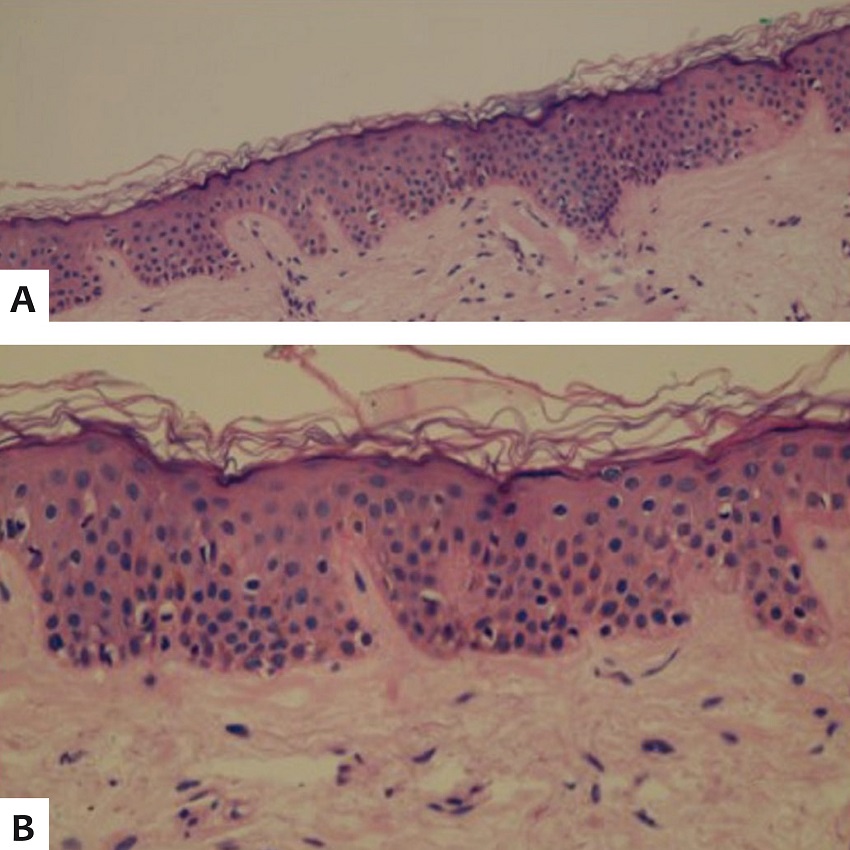 Quanto aos resultados histopatológicos da intervenção, quatro pacientes que já apresentavam epiderme de espessura normal ou aumentada mantiveram; duas pacientes, entretanto, evoluíram com normalização da espessura. Em contrapartida, em três casos verificou-se adelgaçamento da epiderme. Apenas 2/9 pacientes possuíam camada granulosa diminuída no período pré-tratamento, enquanto as demais apresentavam esse parâmetro epidérmico em espessura normal. Porém, nesses dois casos, houve normalização da espessura da granulosa. Não houve alteração do parâmetro inflamação (Figuras 4 e 5).