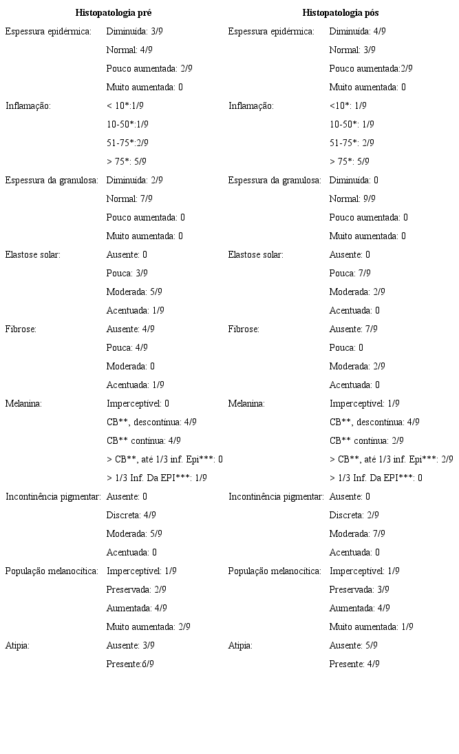 Do ponto de vista histopatológico, 4/9 evoluíram com diminuição da espessura epidérmica, tendo 3/9 passado a apresentar epiderme adelgaçada, enquanto 1/9 normalizou a espessura. Duas das nove pacientes que apresentavam camada granulosa adelgaçada evoluíram com normalização. Quatro das nove pacientes exibiram diminuição do grau de inflamação. Verificou-se diminuição da elastose solar em 4/9 pacientes. Apenas uma das nove pacientes apresentou aumento da fibrose no pós-tratamento. Houve diminuição da quantidade de melanina em 5/9 pacientes, tendo sido observada redução da população melanocítica em 3/9. Entre as seis pacientes que apresentavam atipia queratinocíticas no pré-tratamento, duas evoluíram com normalização.