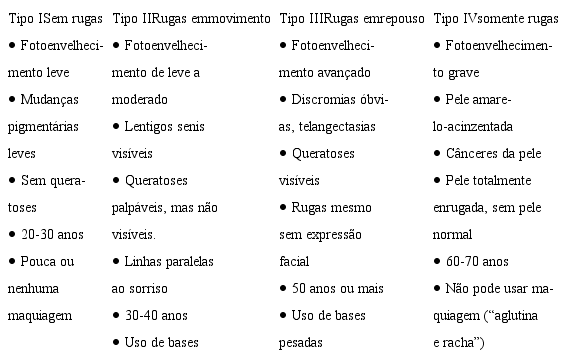 São várias as classificações propostas para a graduação do fotoenvelhecimento. Dentre elas, destaca-se a escala Glogau12 graduada em quatro estágios, com base em achados clínicos de fotoenvelhecimento e suas diferentes intensidades de apresentação (Quadro 1).