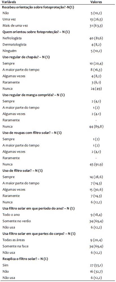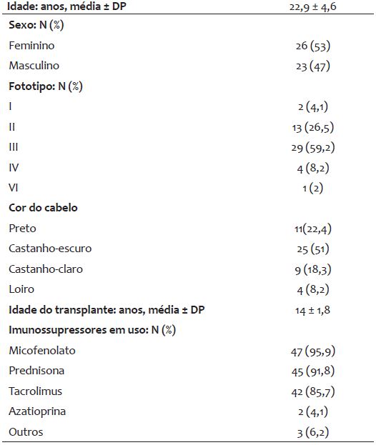Foi realizado estudo transversal, entre 05 de maio e 05 de agosto de 2015. Foi aplicado questionário durante as consultas dos pacientes no ambulatório de pós-transplante de pós-adolescentes do Hospital Santa Clara do Complexo Hospitalar Santa Casa de Misericórdia de Porto Alegre durante o período de realização do estudo. Os pacientes assinaram o Termo de Consentimento Livre e Esclarecido. Dos 56 pacientes que foram consultados nesse período, 49 aceitaram participar do estudo. Os dados foram digitados no programa Excel e posteriormente exportados para o programa para análise estatística. Foram descritas as variáveis categóricas por frequências, e as percentuais e quantitativas por média e desvio-padrão. A existência de associações entre as variáveis foi verificada com a utilização do teste do qui-quadrado. Foi considerado um nível de significância de 5%. O projeto foi aprovado pelo Comitê de Ética da Santa Casa de Porto Alegre (número 27119414.0.0000.5335), e o estudo está de acordo com a Declaração de Helsinki. Ao final da entrevista foi entregue aos pacientes material com orientações e sobre a importância da fotoproteção, especialmente nos pacientes transplantados.