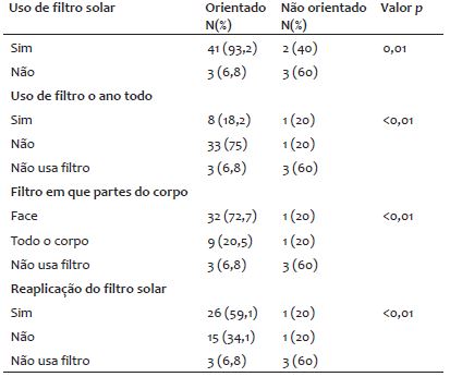 RESULTADOS: Foram entrevistados 49 pacientes, com média de idade de 22,9 anos (DP 4,6). O uso de protetor solar foi de 40% entre quem não havia sido orientado e de 93,2% entre quem foi orientado. Houve associação estatisticamente significativa entre ser orientado e usar protetor solar (p = 0,01). A maioria dos pacientes relatou fazer uso de protetor solar.