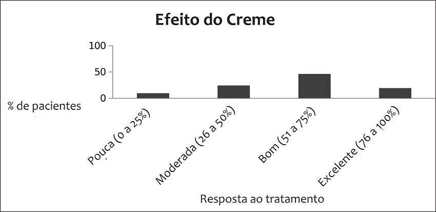 Dos 41 pacientes com vitiligo generalizado, 8 (19,51%) apresentaram excelente resposta ao tratamento, 19 (46,34%) resposta satisfatória, 10 pacientes (24,39%) apresentaram resposta moderada, e 4 (9,75%) evoluíram com ausência de repigmentação após 6 meses de tratamento com a combinação dos ativos estuados.(Gráfico 1).
