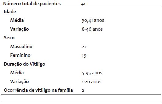Quarenta e um pacientes (22 pacientes do sexo masculino e 19 do sexo feminino) portadores de vitiligo generalizado e estável, que não haviam sido submetidos a tratamento para a doença durante os 6 meses anteriores, foram selecionados para o presente estudo.