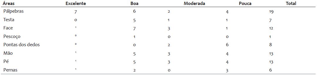A análise da resposta por região corporal indicou que as pálpebras, face e fronte sofreram repigmentação com melhor consistência. Por outro lado, a resposta ao tratamento no dorso dos dedos foi insatisfatória (Tabela 2). A hiperpigmentação inicial começou gradualmente após 2 meses, especialmente na fronte.