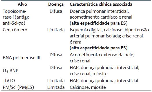 Nos vasos, o fenômeno de Raynaud é a principal manifestação e nos órgãos internos, evidenciam-se a esofagopatia, alveolite com fibrose intersticial pulmonar, vasculopatia pulmonar com hipertensão arterial pulmonar (HAP), crise renal da esclerodermia.1-3 O diagnóstico é firmado pelo quadro clínico compatível, pesquisa de autoanticorpos e capilaroscopia do leito ungueal. Os fatores antinuclear e reumatoide podem ser positivos.1,3 Os principais autoanticorpos associados à esclerodermia estão reunidos no quadro 1. A capilaroscopia do leito ungueal reflete o comprometimento característico de pequenos vasos; sua sensibilidade para o diagnóstico é de 98%. É um dos vários métodos não invasivos de bioengenharia utilizados para investigar a microcirculação da pele. É exame eficaz para avaliar alterações microvasculares na circulação periférica, tendo, portanto, papel significativo para o diagnóstico da esclerose sistêmica.5 Na histologia, há esclerose densa na derme, com colágeno compacto ou hialinizado, glândulas écrinas e pilossebáceas atróficas, perda da gordura subcutânea e infiltrado linfocítico esparso na derme e hipoderme; estruturas anexiais podem ser encarceradas pela excessiva deposição de colágeno.1 Os diagnósticos diferenciais são escleredema, escleromixedema, dermopatia nefrogênica fibrosante, amiloidose, fasciíte eosinofílica, porfiria cutânea tarda, doença enxerto-hospedeiro crônica.1,3 O tratamento é um desafio e compreende a prevenção do vasoespasmo e desbridamento das úlceras cutâneas; para a esclerose cutânea pode ser usada a D-penicilamina, o metotrexato, a Puva, além de uma longa lista de outros agentes testados, a maioria se mostrando ineficaz.3