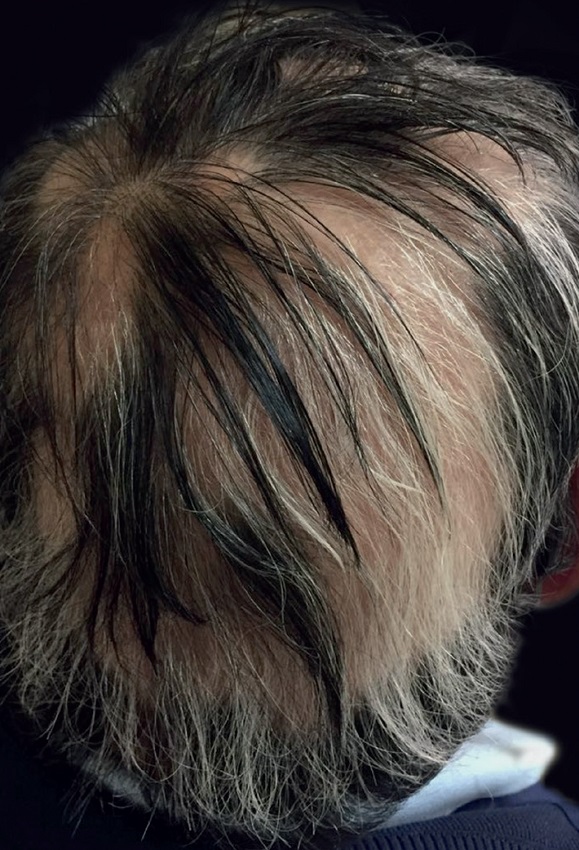 Paciente do sexo masculino, 74 anos, apresentou-se em consulta com queixa de evolução dos cabelos para canície de forma acentuada e, após dois meses, evolução do quadro para queda abrupta e intensa dos cabelos negros. Segundo o paciente, previamente seus cabelos eram mesclados, com maior quantidade de fios escuros.