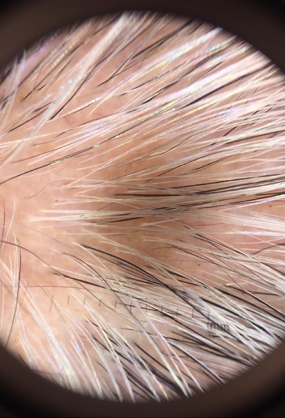 A dermatoscopia, importante exame para confirmação diagnóstica, revelou pontos pretos e pontos de exclamação nas áreas de alopecia (Figura 2).