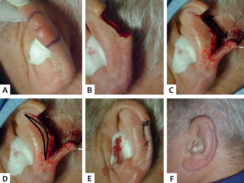 Quando um tumor atinge a hélice, existem duas alternativas clássicas: exérese em V ou retirada em retângulo e avanço de dois retalhos laterais. Entretanto, se ficarem muito tensos, ambos provocam a formação de uma dobra no pavilhão auricular, sendo necessários triângulos de compensação.5