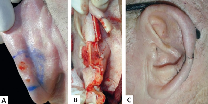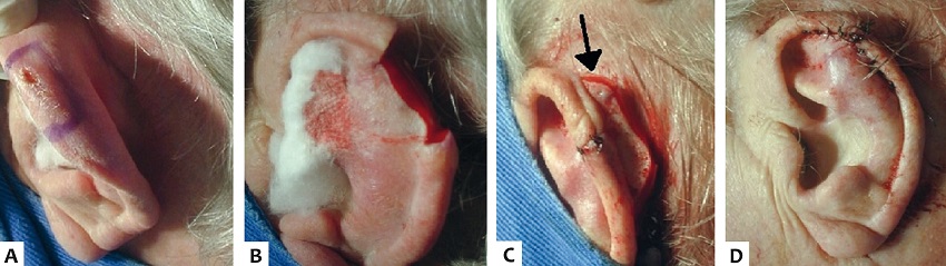Um defeito retangular na hélice da orelha é criado após a exérese das lesões malignas (Figuras 1B, 2B e 3B), realizando-se dois retalhos de avanço bilateralmente ao defeito, no sentido horizontal (Figura 1C). Em seguida, é feito o descolamento de pele que recobre a cartilagem em ambos os lados, com aproximação e sutura inicialmente da cartilagem com náilon 4-0, e a seguir a da pele, com náilon 5-0, evitando a coincidência das duas em um mesmo plano, e criando um escalonamento entre elas, ainda que sob discreta tensão inicial (Figuras 1C e 2C).
