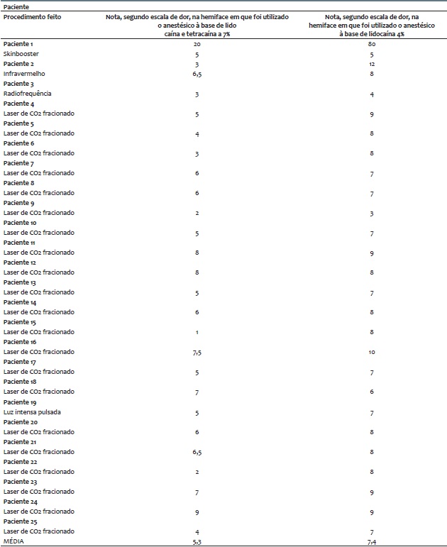 Methods: Twenty-five patients underwent facial dermatological procedures after the application of two commercial preparations: one containing 7% lidocaine and 7% tetracaine (applied in one hemiface) and the other containing 4% lidocaine. Each of the preparations was applied in one hemiface. Pain intensity was assessed using the Visual Numeric Pain Scale (VNS) at the end of the procedure.