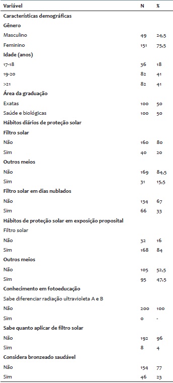 Foram coletadas variáveis demográficas e de conhecimento sobre fotoproteção, incluindo: gênero (masculino ou fe-minino), idade (em anos, categorizada posteriormente em 1718; 19-20 e >21 anos), uso de filtro solar diariamente e quando exposição proposital (nunca, às vezes, sempre), uso de outros meios de fotoproteção diariamente e em exposição proposital (sim ou não), meios de fotoproteção além do filtro solar (sim ou não e resposta descritiva em caso de sim), exposição em câmara de bronzeamento artificial (nunca, uma ou mais vezes), conhecimento sobre quanto aplicar do produto e sobre a diferença da radiação ultravioleta A e B, opinião sobre bronzeado ser saudável (sim ou não e resposta descritiva em caso de sim) e o uso de filtro solar em dias nublados (sim ou não).