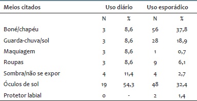 O uso de outros meios de fotoproteção corresponde a 15,5% diariamente e 47,5% quando de exposição proposital. Além disso, 80% e 16% não utilizam o filtro solar nessas mesmas situações, e 67% não o utilizam em dias nublados (tabela 1). Nenhum dos participantes submeteu-se à câmara bronzeadora artificial.