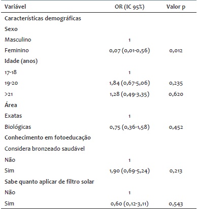 O gênero mostrou-se associado ao comportamento de risco, que foi significativamente menor entre as mulheres OR = 0,07 (IC95%: 0,01-0,56). Idade, área da graduação, conhecimento da diferença entre raios ultravioleta A e B, considerar bronzeado saudável e saber quanto aplicar de filtro solar não se associaram ao comportamento de risco de exposição solar (tabela 3).