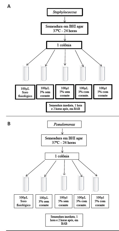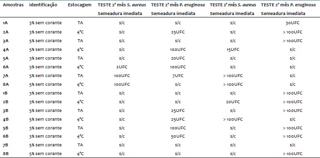 Na mesma ocasião, a ação bactericida foi testada inicialmente com uma alíquota de 100µL do ácido retinoico de cada embalagem, diluída em 480µL de meio BHI acrescido de 20µL de uma cultura de 24 horas de Pseudomonas aeruginosa. O mesmo experimento foi repe tido com Staphylococcus aureus (Figura 1). Nesse procedimento o ácido retinoico foi diluído cinco vezes. A ação bactericida do ácido retinoico foi também avaliada no segundo e no terceiro mês de validade. Dessa vez foi utilizado o pr duto sem diluição, na forma em que é empregado para peelings e recomendado pelos fabricantes, a 3% e 5%, com e sem tonalizante, acondicionado à TA e a 4ºC (temperatura de geladeira reeomendada pelas farmácias para a conservação do produto). Uma alíquota de 500µL de cada frasco, foi colocada em microtubos estéreis, inoculados com uma colônia de P aeruginosa ou S. aureus, e uma alça do produto homogeneizado foi semeada em placas de BHI agar em três situações: logo após a homogeneização, uma e duas horas após. Como controle, as bactérias foram inoculadas também em uma alíquota de soro fisiológico estéril. As placas foram incubadas a 37ºC durante 24 horas, sendo então observado o crescimento da bactéria (Figura 2).