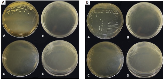 A esterilidade das quatro soluções de cada farmácia foi avaliada no mesmo dia da fabricação, sendo que uma alíquota de 100µL de cada amostra foi semeada em placa de meio BHI agar (Brain Heart Infusion) e incubada a 37ºC durante 24 horas, observando-se o crescimento bacteriano.