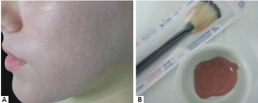 Diante da capacidade bactericida comprovada pelas soluções de ácido retinoico nas concentrações de 3% e 5% com e sem tonalizante, propusemos sua utilização como agente de drug delivery em associação com IPCA®. Para tanto foi proposta a injúria moderada (Figura 3) para a administração do ácido retinoico 5% tonalizado (Figura 4), considerando que com esse end point a pele estaria sujeita à recepção do ativo, sem que o procedimento sofresse a interferência de sangramento mais intenso, como o observado na injúria profunda. Da avaliação dessa associação participaram 12 voluntárias com queixas de cicatrizes de acne e fotoenvelhecimento, com idade entre 21 e 38 anos, provenientes do Ambulatório de Cosmiatria da Santa Casa de Misericórdia do Recife. O estudo foi conduzido de acordo com as recomendações da declaração de Helsinki de 1996, modificada em 2013, tendo sido autorizado pelo Comitê de Ética da instituição. O procedimento foi realizado sob anestesia tópica com creme de lidocaína 4% (Dermomax® Aché, São Paulo, Brasil) aplicado 40 minutos antes da intervenção. Foi utilizado um instrumento com comprimento das agulhas de 1,5mm (Dr.Roller® Mooham Enterprise Co. Gyeonggido South Korea, Anvisa n. 80669600001). Procedeu-se a movimentos de vai e vem, construindo faixas horizontais, posteriormente intercruzadas por faixas geeticais e diagonais até resultar em um eritema difuso em toda a face com modesto sangramento pontuado, caracterizando a injúria moderada (Figura 3). Imediatamente após, uma solução de ácido retinoico 5% tonalizado foi aplicada com pincel estéril, em toda a extensão da área tratada (Figura 4) e deixada durante duas horas, quando foi removida com água corrente e sabonete líquido, em domicílio. Foi recomendado não aplicar nada sobre a pele nas oito horas seguintes, utilizando-se a seguir filtro solar FPS > 50. Todos os sujeitos da avaliação foram fotografados antes e após 30 dias da intervenção pelo mesmo investigador, com a mesma máquina fotográfica e usando a mesma incidência luminosa. Oito dias após a intervenção foi orientado o retorno ao ambulatório para avaliação de tolerabilidade da intervenção.