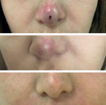 MBF, do sexo feminino, 27 anos, procurou atendimento médico por insatisfação estética na região nasal, apesar de rinoplastia prévia. Após avaliação, realizou-se a aplicação de 0,8ml de ácido hialurônico, Emervel Deep® (Galderma, Otten, Suíça), na região da columela e ponta nasal com agulha, aspirando-se previamente à injeção, sem qualquer alteração no momento do procedimento. Decorridas 36 horas, a paciente retornou ao consultório apresentando dor local intensa, palidez entremeada com áreas de livedo reticularis, compatível com oclusão arterial. Para a reversão do quadro, foi utilizada hialuronidase Biometil ® (Laboratório Biometil, São Bento do Sul, Santa Catarina), 1600UI em aplicação única associada a medicamentos orais: Aspirina® (Bayer, Barmen, Alemanha) 100mg/ dia, cilostazol (Eurofarma, São Paulo, Brasil) 100mg 12/12 horas, prednisona (Eurofarma, São Paulo, Brasil) 40mg/dia, rivaroxabana (Bayer, Barmen, Alemanha) 20mg/dia, ciprofloxacina (Eurofarma, São Paulo, Brasil) 500mg 12/12 horas, e clindamicina (Teuto-Brasileiro S/A, Anápolis, Goiás) 300mg 12/12 horas, durante 15 dias. Foi realizada ultrassonografia com Doppler - US Doppler, do local, que demonstrou fluxo sanguíneo arterial e venoso normais, três sessões de câmara hiperbárica nos primeiros três dias e compressas mornas várias vezes ao dia durante sete dias. A paciente evoluiu com melhora progressiva e resolução completa do quadro após três semanas.