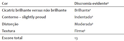 O remodelamento que ocorre após o uso do laser fracionado de CO2 se dá pelo efeito fotomecánico, que remove as bandas cicatriciais escleróticas contendo colágeno espessado e libera o tecido com contratura, mediante remodelamento dérmico. Na literatura, o uso do laser de CO2 para tratamento de cicatrizes demonstra promover melhora na textura e na pigmentação. No caso deste relato a melhora foi observada em textura, pigmentação, contorno, brilho e distorção. Além disso, os estudos que utilizaram as maiores densidades obtiveram os melhores resultados, o que justifica os parâmetros escolhidos para uso no presente caso.5 Particularmente para cicatrizes hipertróficas, resultados positivos podem ser observados na redução da firmeza da cicatriz e na melhora da superfície e das contraturas.6