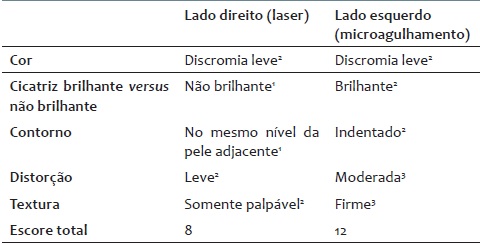 A melhora das cicatrizes foi avaliada com a escala de Manchester (5 a 28, sendo que os maiores escores representam as piores cicatrizes).4 O lado direito da cicatriz, tratado com o laser de CO2 apresentou os melhores resultados (Figuras 3A e B). A escala de Manchester inicial para ambos os lados tratados era de 13 pontos (tabela 1); após o tratamento a área tratada com o laser teve melhora de cinco pontos, e a área tratada com microagulhamento de um ponto (tabela 2).