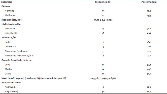 A tabela 1 mostra os dados demográficos e características básicas da população estudada. Foram incluídos 43 indivíduos, sendo que a maioria dos pacientes era do sexo masculino (76,7%) e adolescente (15,77 ± 0,84 anos). Pode-se observar que 25 pacientes (58,1%) tinham história familiar positiva, enquanto 18 pacientes (41,9%) não tinham histórico da doença. Com relação aos hábitos alimentares, 7 pacientes (16,3%) consumiam leite, 3 pacientes (7,0%) consumiam chocolate, enquanto 31 pacientes (72,1%) consumiam alimentos gordurosos. Dois indivíduos (4,7%) consumiam alimentos ricos em açúcar. Quatorze (32,6%) indivíduos foram incluídos na categoria de acne leve e moderada, respectivamente, ao passo que 15 pacientes (34,9%) foram incluídos na categoria de acne grave. A mediana do nível de ácidos graxos livres foi de 24.358 ppm e o resultado positivo do PCR para P. acnes foi obtido em 5 pacientes (11,6%), tendo sido negativo em 38 pacientes (88,4%).