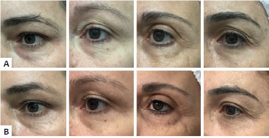 Todas as sessões foram realizadas pela mesma médica, sob anestesia tópica com lidocaína creme a 4% (Dermomax® Aché, Guarulhos, SP, Brasil) e infiltração de lidocaína a 2% com epinefrina, seguindo-se limpeza com clorexidine aquosa e umidificação da pele com gaze e soro fisiológico estéril. Foi empregado o aparelho de radiofrequência FRAXX® com Wavetronic 5000, no modo CUT, das seguintes formas: 1) Megapulse, potência 60%, sequência 2, active 60ms, delay 60ms, acoplado à ponteira-padrão com 64 microagulhas (8x8) em metade das pacientes; 2) Single pulse, potência 30%, active 30ms, acoplado à ponteira Lima 8 de 2,5mm em outra metade das pacientes. O limite na pálpebra inferior foi 2mm da borda ciliar e na pálpebra superior o sulco palpebral. No pós-procedimento, os pacientes usaram esparadrapo microporado por 24 horas, regenerador Cicaplast Baume® (La Roche Posay, Rio de Janeiro, RJ), duas vezes ao dia durante cinco dias e filtro solar FPS 60. O primeiro retorno ocorreu após cinco dias para avaliar os efeitos colaterais tais como edema, equimoses e ulcerações. Após 30 dias da última sessão, as pacientes responderam ao questionário de satisfação e foram fotografadas para julgamento clínico. No questionário, foi classificado o grau de satisfação como: insatisfeito, satisfeito e muito satisfeito. Também foi analisada a ocorrência de efeitos adversos como edema, equimose, hipercromia e outros.