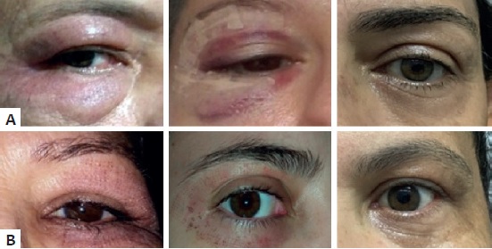 Com relação aos efeitos colaterais, obtivemos resultados semelhantes ao do estudo de Lima,16 com média de três dias de edema e 6,2 dias de equimose. Com relação à hiperpigmentação pós-inflamatória, ocorreu em 42,1% de nossas pacientes − valor inferior aos 58% obtidos por Lima16 – e se resolveu em média de 22,2 dias; não ocorreram infecções, hipocromia ou cicatrizes. Outros efeitos colaterais ocorridos foram prurido (15,7%), aumento da sensibilidade local (2,6%), erupção acneiforme (2,6%) e eczema de contato (2,6%).