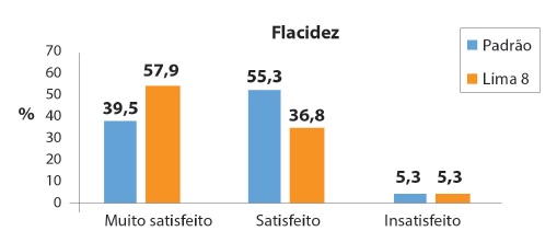 Com relação aos resultados da satisfação dos pacientes quanto aos tratamentos testados, os aspectos investigados foram flacidez, rugas, textura e tonalidade da pele tratada. Os resultados estão resumidos nos gráficos 1 a 4. Para o item flacidez, 57,9% dos pacientes submetidos ao tratamento com ponteira Lima 8 relataram estar muito satisfeitos, enquanto esse percentual no grupo-padrão foi de 39,5%; 55,3% dos pacientes ficaram satisfeitos com os resultados proporcionados pelo tratamento no grupo-padrão e 36,8% no grupo Lima 8. De modo geral, ambos os tratamentos apresentaram resultados expressivos no que diz respeito à flacidez, visto que os percentuais agregados (muito satisfeito e satisfeito) foram 94,8% e 94,7% para o grupo-padrão e Lima 8, respectivamente.
