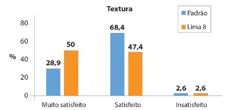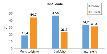 Quanto aos aspectos textura e tonalidade, os resultados indicaram que os maiores percentuais de pacientes que se classificaram como muito satisfeitos foram encontrados no grupo Lima 8: 50% e 44,7% para textura e tonalidade, respectivamente. Para o grupo-padrão esses percentuais foram 28,9% e 18,4%, respectivamente. De modo geral, com relação à textura e à tonalidade, os procedimentos comparados tiveram resultados semelhantes, sendo os percentuais acumulados para as categorias muito satisfeito e satisfeito 97,3% (padrão) e 97,4% (Lima 8) para textura e 65,8% (padrão) e 68,4% (Lima 8) para tonalidade. Os resultados ainda apontaram que o aspecto tonalidade foi aquele com o pior índice de satisfação quando comparado aos demais aspectos, para ambos os tratamentos sob avaliação.