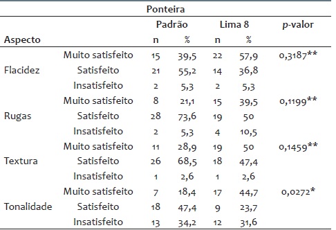 Para confrontar os resultados da satisfação dos pacientes quanto às terapêuticas apresentadas foram realizados testes de comparação, pelo teste qui-quadrado de homogeneidade. Os p-valores dos testes para cada um dos aspectos investigados foram considerados significativos quando p < 0,05. Conforme demonstrado na tabela 1, os resultados evidenciaram que para os aspectos flacidez, rugas e textura não houve diferenças estatísticas significativas (p-valores > 0,05), ou seja, ambos os tratamentos apresentaram resultados bastante similares quanto à satisfação com os resultados. Quanto ao aspecto tonalidade, porém, foi verificada diferença significativa entre o tratamento com ponteira-padrão e aquele baseado na ponteira Lima 8 no nível de significância especificado (p-valor = 0,0272), conforme a tabela 1.