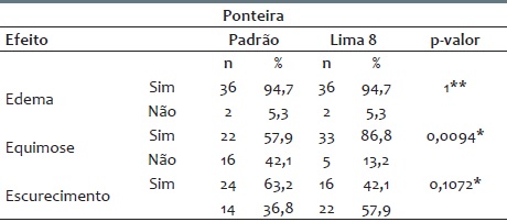 Em relação aos principais efeitos colaterais, foi avaliada a ocorrência de edema, equimose e escurecimento, estando sua análise detalhada na tabela 2. Com relação à ocorrência de edema, ambos os tratamentos apresentaram igual e expressivo percentual: 94,7%. Dos pacientes submetidos à ponteira Lima 8, 86,8% apresentaram como efeito adverso a equimose, com percentual superior ao do grupo-padrão (57,9%). O escurecimento, esteve presente em 63,2% dos pacientes do grupo-padrão e em menos da metade do grupo Lima 8.