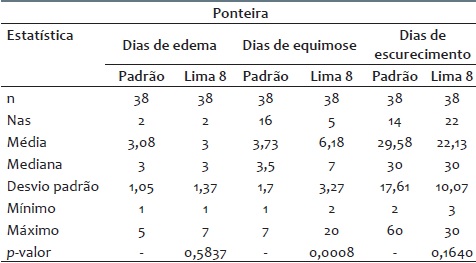 Considerando a variável dias de edema, observou-se que o tempo médio foi de 3,08 ± 1,05 dias para a ponteira-padrão, enquanto que para a Lima 8 foi de 3 ± 1,37. No que se refere ao tempo de equimose, o tempo médio foi de 3,73 ± 1,7 dias para o tratamento com a ponteira-padrão, e superior com a ponteira Lima 8, cujo tempo médio foi de 6,18 ± 3,27. Quanto ao tempo de escurecimento, a ponteira-padrão apresentou tempo maior do que o apresentado pela Lima 8.