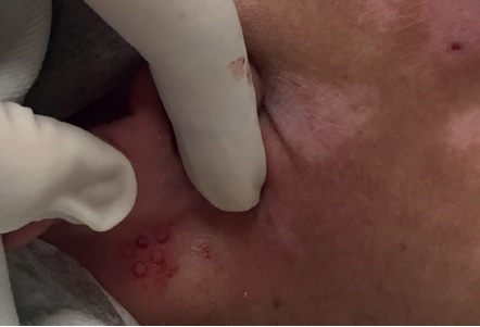 A área doadora selecionada foi a região retroauricular, tendo sido retirados fragmentos com punchs de 2mm após anestesia local (Figura 3). Os fragmentos doadores são constituídos de epiderme, derme e subcutâneo. Após a retirada, foi realizado shaving para separar cuidadosamente a derme papilar e a epiderme da derme reticular e do subcutâneo. Em seguida, com o auxílio de uma lupa, os enxertos constituídos somente de derme e epiderme foram reduzidos em 4-6 fragmentos menores (Figura 4).