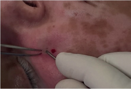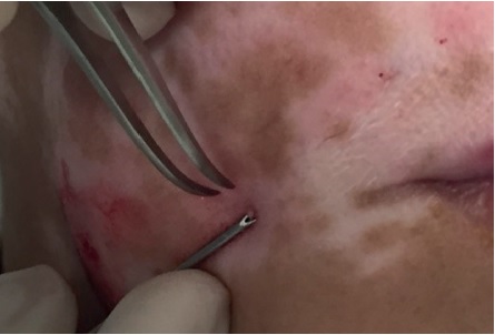 Após anestesiar a área receptora, um desses pequenos fragmentos foi colocado na ponta de uma agulha 18G e em seguida a área anestesiada foi perfurada com o bisel da agulha. Com a ajuda de uma pinça, o fragmento foi empurrado para o pertuito gerado pela agulha, que foi cuidadosamente retirada, de modo a deixar o fragmento no local perfurado (Figuras 5 e 6). Dessa forma, todos os fragmentos retirados são implantados na área receptora com a distância média de 1cm entre eles.