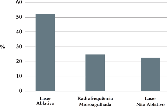 O procedimento mais realizado foi o laser fracionado ablativo, seguido de radiofrequência microagulhada e laser fracionado não ablativo (Gráfico 2).