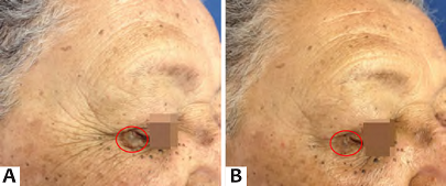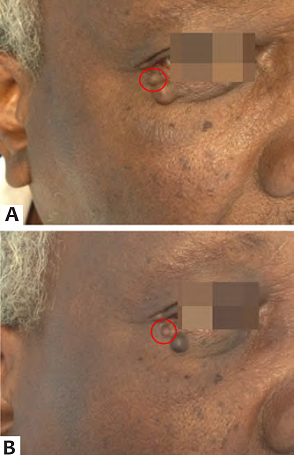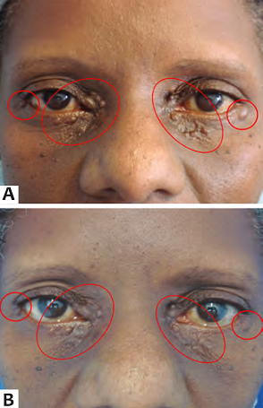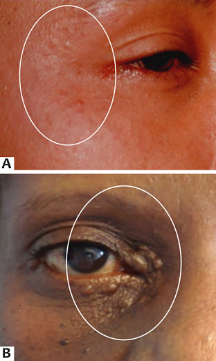 Clinicamente, surgem sob a forma de uma ou mais lesões de tamanhos variados, localizadas no segmento cefálico, preferencialmente em fronte, regiões malares e palpebrais, sendo o canto externo da pálpebra inferior o de maior incidência.6