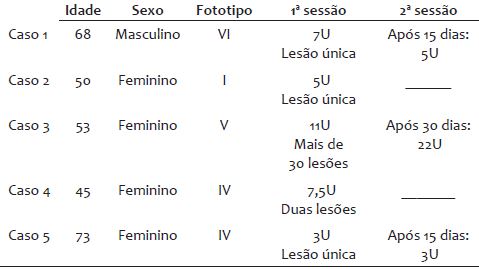 A toxina botulínica A foi reconstituída com 2ml de SF para cada frasco de 100U. A dose total utilizada em cada paciente variou de 5U a 33U, dois pacientes (2 e 4) foram tratados em apenas uma sessão enquanto em três deles (1, 3 e 5) a segunda sessão ocorreu entre 15 e 30 dias após a primeira (Tabela 1).
