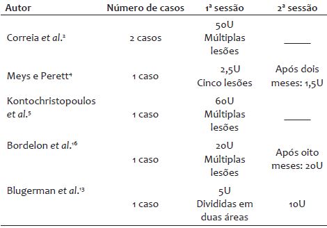 Por não existir consenso sobre a dose a ser aplicada, os pacientes receberam doses não padronizadas, variando de 5U a 33U da substância de acordo com o número de lesões. Na literatura, a dose total de toxina botulínica variou de 4U4 a 60U5 (Tabela 2). Todos os casos eram de hidrocistomas múltiplos (mais de cinco) e pequenos. A dose média aplicada foi de 1-4U por lesão. Neste estudo, a dose cumulativa do neuromodulador aplicada não ultrapassou 33U, e a média de unidades por lesão ficou em aproximadamente 3U, porém apenas um paciente apresentou mais de cinco lesões (caso 3).