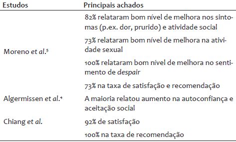 Estudos prévios demonstraram que o tratamento com laser de CO2 melhorou a autoconfiança dos pacientes assim como sua vida social e sexual. Algermissen et al.4 reportaram que as cicatrizes despigmentadas do tratamento a laser foram mais aceitáveis aos pacientes do que as cicatrizes das excisões cirúrgicas, em concordância com a opinião da paciente aqui focalizada.