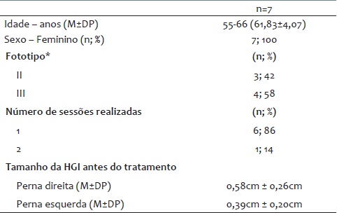 Sete pacientes do gênero feminino, com idades entre 55 e 66 anos, apresentando HGI nas pernas, foram selecionadas para este estudo-piloto. Todas as pacientes assinaram termo de consentimento informado, tendo sido o estudo conduzido pelas regras emanadas pela Declaração de Helsinki. Cinco lesões foram selecionadas em cada perna de cada paciente, as quais foram mensuradas quanto ao seu maior diâmetro para permitir análise comparativa de forma objetiva ao final do estudo. Ambas as pernas de cada paciente foram submetidas a duas sessões mensais de laser fracionado ablativo Er:YAG 2940nm (Etherea MX®, Vydence Medical, São Carlos, São Paulo, Brasil) ponteira de 8mm, 100MTZ/cm 2, single mode (500µs), com uma energia de 12,5mJ/MTZ, seguido pela limpeza com soro fisiológico 0,9% imediatamente após o procedimento para remoção de debris. Logo após o término do protocolo de laser descrito, uma formulação em sérum anidro contendo piperina 20% foi aplicada (drug delivery) somente na perna direita de cada paciente; as pacientes foram instruídas a aplicar a formulação por três dias após o procedimento, três vezes ao dia. Uma consideração importante é que a piperina sofre fotoisomerização e perde sua habilidade de estimular melanócitos caso seja exposta à luz visível ou à radiação ultravioleta; por este motivo, as pacientes foram orientadas a evitar exposição solar durante o período de aplicação do produto. 13 As pacientes foram avaliadas um mês após a segunda sessão; nesta ocasião, todas as lesões foram medidas novamente em seu maior diâmetro e registros fotográficos das lesões foram realizados para análise subjetiva dos resultados.