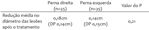 No total, 35 lesões de HGI foram tratadas nas pernas direitas das pacientes e 35 nas pernas esquerdas. O tamanho das lesões variou de 0,2cm a 1,5cm. O tamanho médio das lesões antes do tratamento foi de 0,58cm na perna direita, em que a piperina foi aplicada no drug delivery (intervalo de confiança (IC) 0,45 - 0,7cm, desvio-padrão (DP): 0,06cm) e 0,59cm na perna esquerda (IC 0,49 - 0,68cm, DP: 0,05cm), em que apenas o laser foi realizado. Trinta dias após a segunda sessão, o tamanho médio das lesões da perna direita foi de 0,39cm (IC 0,28 - 0,51cm, DP: 0,06cm) e de 0,45cm na perna esquerda (IC 0,34 - 0,55cm, DP: 0,05cm) (Tabela 2). O teste T pareado demonstrou que ambos os tratamentos reduziram significativamente o tamanho das lesões (p< 0,00008 para perna direita e p<0,002 para a perna esquerda). O método das GEEs demonstrou que não houve diferença estatística entre os grupos em relação à redução do tamanho das lesões (teste de Bonferroni 0,083). A avaliação subjetiva atingiu melhores escores para a perna direita (laser + piperina) (média 4,72 versus 4,28 para a perna esquerda), no entanto esta diferença não atingiu significância estatística (p-0,126).
